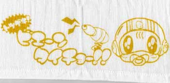 ◆ 白の木綿付きタオルに 黄色でプリント ◆ ”タイチョー”さんは娘さんが モデルだそうです。(^-^) こんなに可愛く描いてもらうと ”タイチョー”さんも喜んで いらっしゃると思います。 赤ちゃんだったタイチョーさんも 大きくなられているのでしょうね。 |
